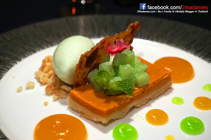 จบของคาวแล้วก่อนจะถึงเมนูของหวานตัวจริง ต้องทาน Pre Dessert กันก่อนจ้า เมนูนี้เป็นไอศกรีมแคนตาลูป สอดไส้ด้านในด้วยมิโดริ ทานกับแก้วมังกรและแคนตาลูปที่ตกแต่งอยู่ด้านล่าง