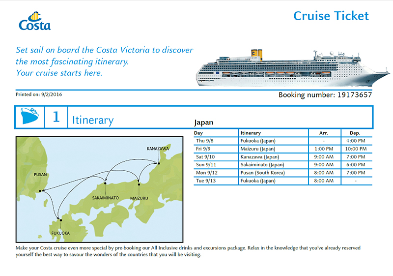 ตารางการเดินทางคร่าวๆของทริปล่องเรือสำราญ Costa Cruise Line ท่องเที่ยว 5 เมือง 2 ประเทศ ญี่ปุ่น-เกาหลีใต้
