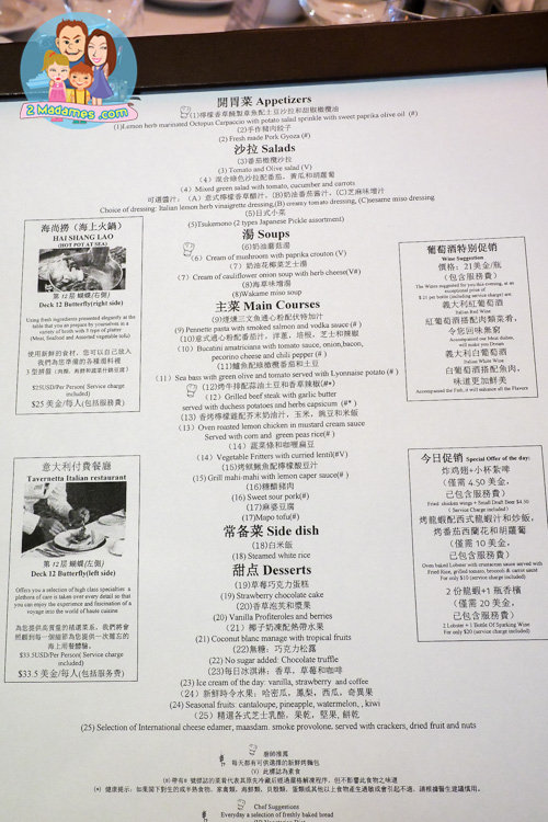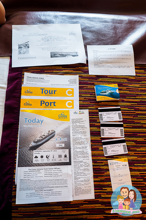 ในวันแรกจะมีบัตรบนประจำตัวมาวางให้ที่ห้อง บัตรใบนี้สำคัญมาก ไว้แสดงตัวเวลาขึ้นลงเรือที่ท่าเรือ มีบัตรบอกโต๊ะทานอาหารที่ห้องอาหารพร้อมเวลา และจะมีกระดาษใบใหญ่ๆคล้ายๆหนังสือพิมพ์บอกว่าวันนี้มีกิจกรรมอะไรบนเรือบ้างตั้งแต่เช้ายันดึกเลย