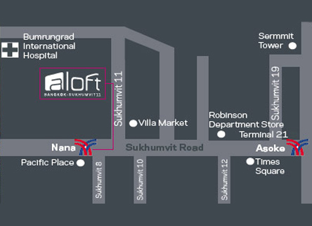 โรงแรม Aloft Bangkok – Sukhumvit 11 อยู่ย่านใจกลางเมืองสุขุมวิท 11 เลยครับ เดินทางสะดวก มีรถไฟฟ้าผ่านที่หน้าปากซอยครับแล้วต้องเดินเข้ามาหน่อย ลงที่สถานีนานา นะครับ