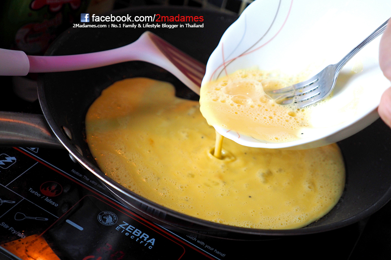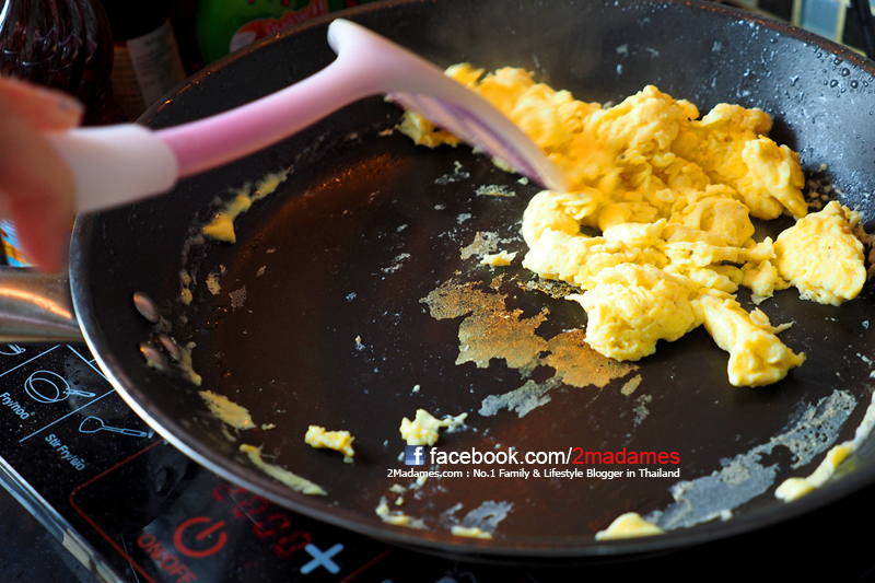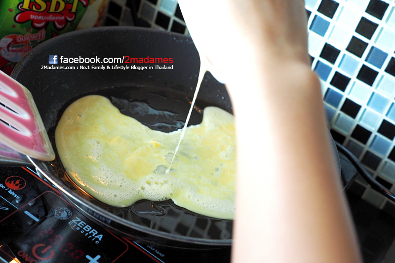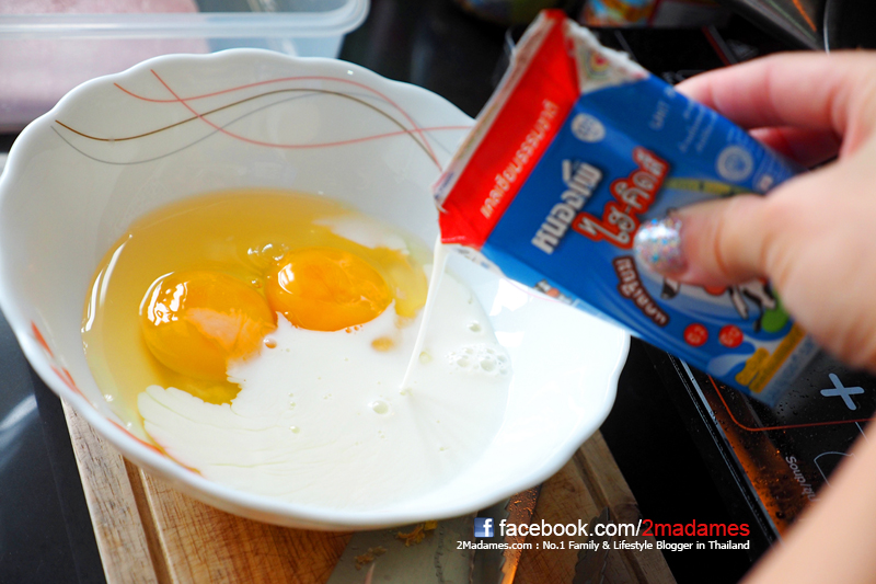 ตีไข่กับนมให้เป็นเนื้อเดียวกันเลย แล้วเทลงกระทะขณะที่กระทะยังไม่ร้อนมาก คนไปเรื่อยๆอย่าหยุดเลยนะค่ะ