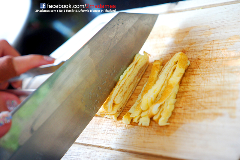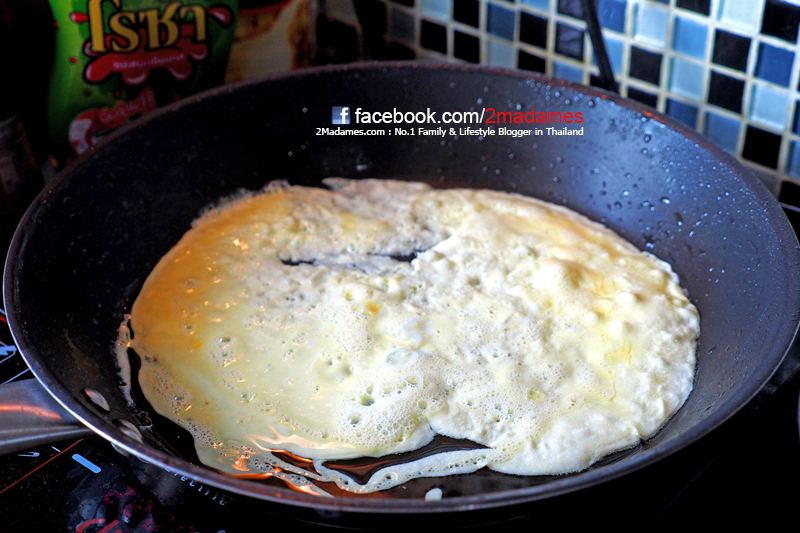 เกลี่ยไข่ให้ทั่วกระทะรอจนด้านล่างสีสวยก็พับครึ่ง แล้วตลบอีกครึ่งให้เป็นม้วนยาวๆ