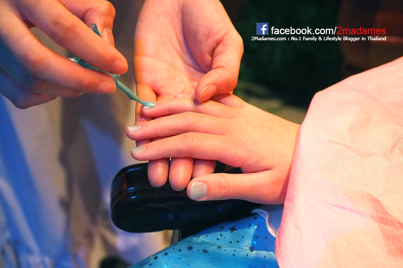 เมื่อแต่งตัวเสร็จก็จะไปนั่งเก้าอี้สวยๆ เพื่อทาเล็บ แต่งหน้า ทำผม กันต่อไป จุดที่นั่งตรงนี้เด็กๆจะยังไม่เห็นตัวเองในขณะแต่งหน้าทำผม พนักงานก็บรรจงทาสีเล็บที่เข้ากับสีชุด แต่งตาสีฟ้าๆ ทาปากด้วยลิปกลอส ทุกอย่างให้ผลิตภัณฑ์ที่ปลอดภัยสำหรับเด็กทั้งนั้นเลย