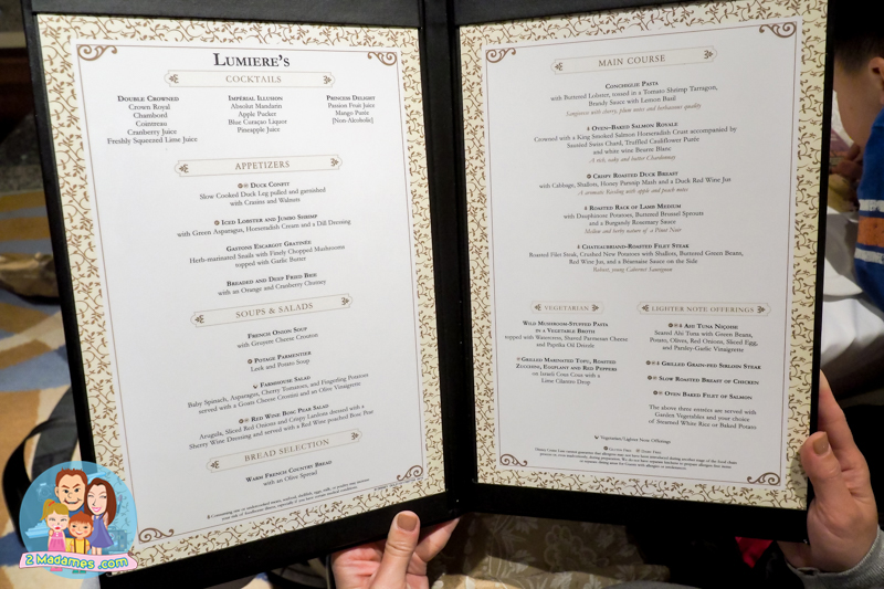 เริ่มห้องแรกที่ห้อง Lumiere’s จะตกแต่งหรูหราธีม Beauty and the Beast โดยจะเสิร์ฟอาหารสไตล์ Contemporary French พูดตามตรงเรากระโดดข้ามไปจานหลักเลยก็หลายมื้อ เพราะอิ่มแน่นมากทั้งวัน มีเมนูอาหารสำหรับเด็กๆด้วยนะ