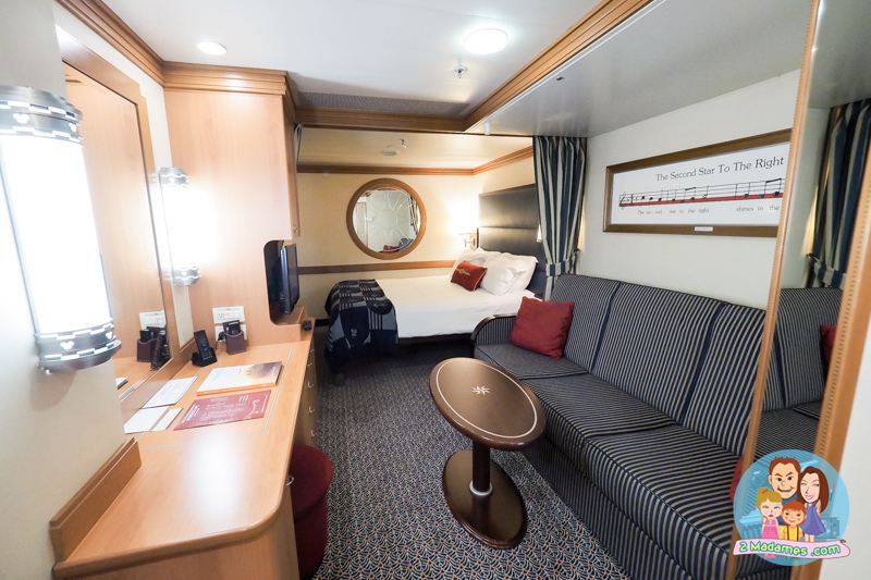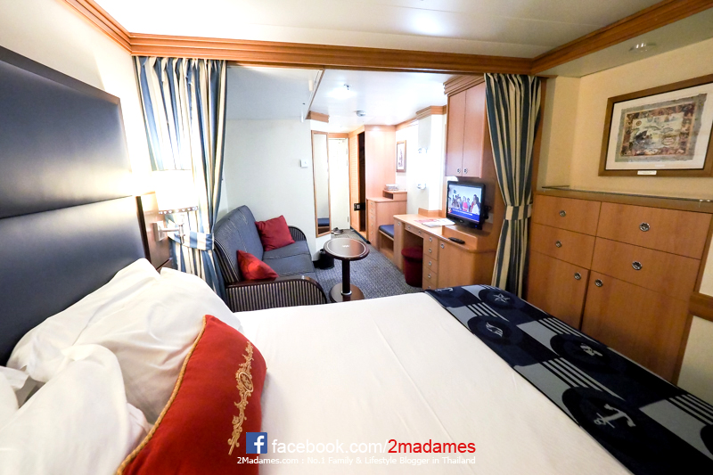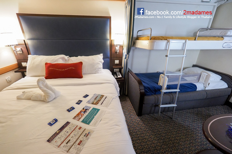 ห้องนี้เป็นแบบ Deluxe Inside Stateroom 1 เตียงใหญ่ พร้อมกับโซฟาที่แปลงร่างเป็นเตียงสองชั้นได้ ที่จริงห้องนี้เป็นแค่แบบห้องพักที่ถูกที่สุดในเรือ ไม่มีหน้าต่างใดๆ แต่ก็ไม่ได้รู้สึกว่าอึดอัดเลย ห้องกว้าง แถมมีที่เก็บของเยอะมาก