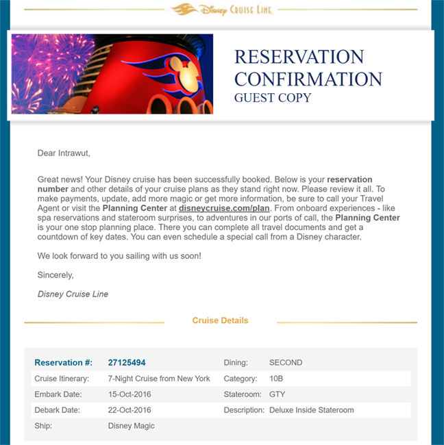 - หลังจากจองเรือเสร็จแล้ว ให้เรารีบเข้าไปที่ https://disneycruise.disney.go.com/ Login แล้วรีบจองกิจกรรมต่างบนเรือก่อน เช่น กิจกรรมถ่ายภาพกับเหล่าเจ้าหญิง (มีจำนวนจำกัด เต็มเร็วมาก เราจองไม่ทันเหมือนกัน), จองวันกินอาหารเช้ากับตัวการ์ตูน, จองไปสวนสนุกที่ Disney World Orlando, จองกิจกรรมต่างๆบนเกาะ Castaway Cay, จองสปาหรือคิวทำสวยที่ Bibbidi bobbidi boutique เป็นต้น