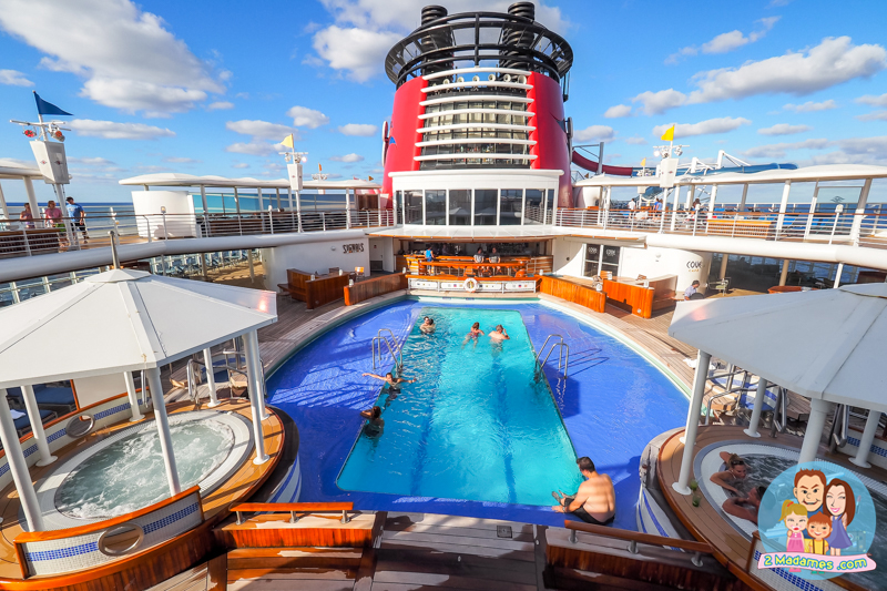 ถัดไปจะเป็นสระว่ายน้ำตรงกลางเรือ สระนี้จะพิเศษหน่อยตรงมีจอทีวีอันใหญ่ให้เล่นน้ำไป ดูการ์ตูนไปได้ด้วย