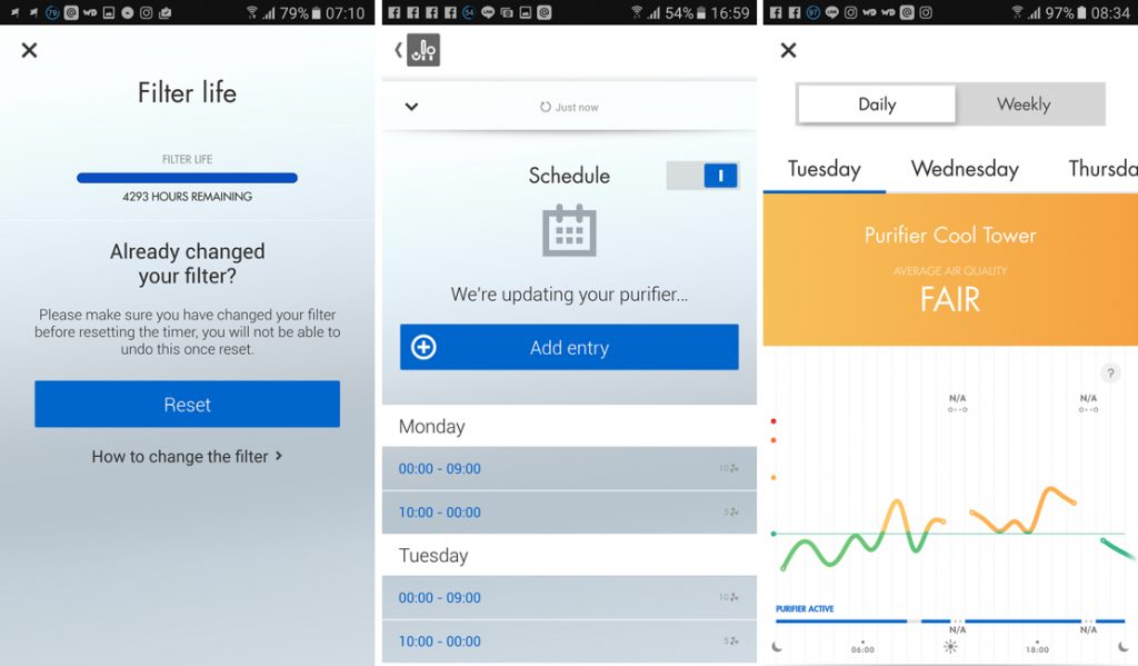 นอกจากนี้ยังสามารถดูอายุการใช้งานของตัวกรอง, ประวัติคุณภาพอากาศย้อนหลัง, ตั้งค่าการทำงานอัตโนมัติว่าช่วงเวลาไหนให้เครื่องทำงานแรงลมเท่าไหร่ หรือใช้เป็นรีโมทควบคุมการทำงานก็ได้