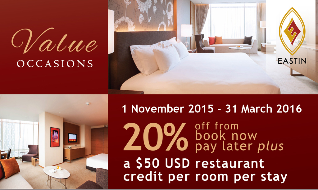 จองเพื่อรับสิทธิโปรโมชั่นได้ตั้งแต่วันที่ 1 – 31 กรกฎาคม 2558 ผ่าน www.eastinhotelsresidences.com