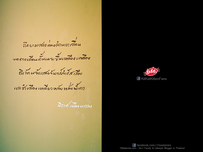 หลังจากเลือกอาหารกันแล้วก็นั่งเล่นกันไปค่ะ บริเวณโต๊ะที่เหมียวๆกับที่รักนั่ง จะมีข้อความจากนิราศ เมืองแกลงเขียนไว้ค่ะ คำว่า “วัดแจ้ง” เป็นชื่อสั้นๆที่ใช้เรียกชื่อ “วัดอรุณราชวรารามราชวรมหาวิหาร” ค่ะ นิราศเมืองแกลง เป็นนิราศเรื่องแรกของท่านสุนทรภู่กวีเอกของเมืองไทยค่ะ เขียนเมื่อตอนที่จำเป็นที่จะต้องออกเดินทางจากนางจันอันเป็นที่รักค่ะ