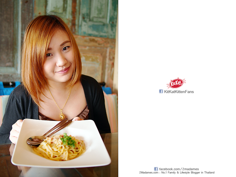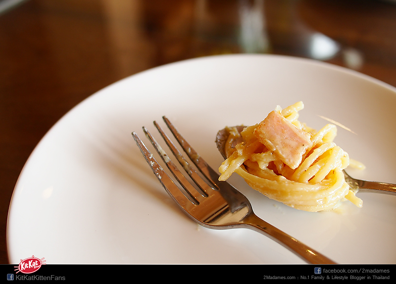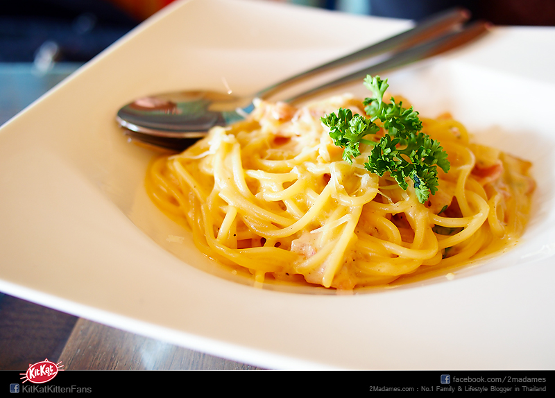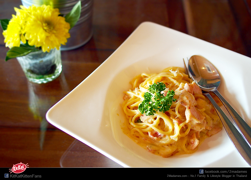 อาหารมาเสริฟแล้วค่ะ อาหารเส้นๆที่เฝ้ารอ สปาเก็ตตี้คาโบนาร่า เนื่องจากวันนั้นเส้น เฟตูชินีหมดค่ะ