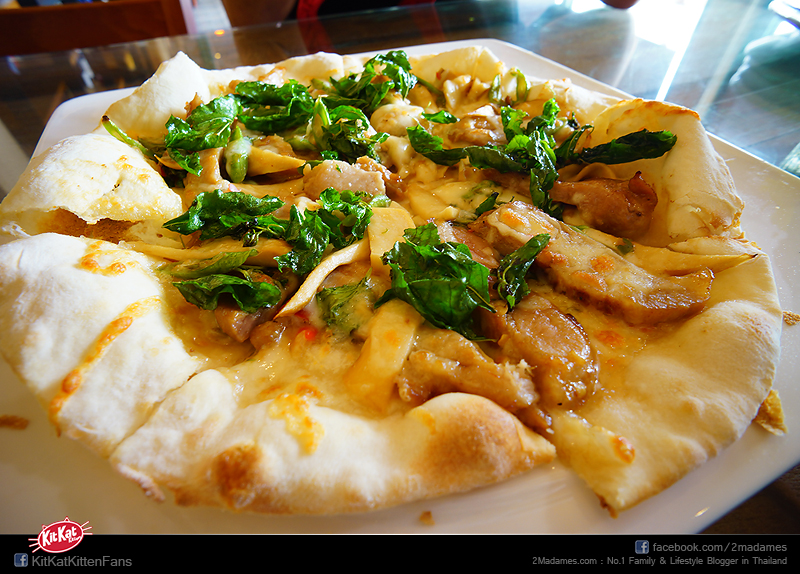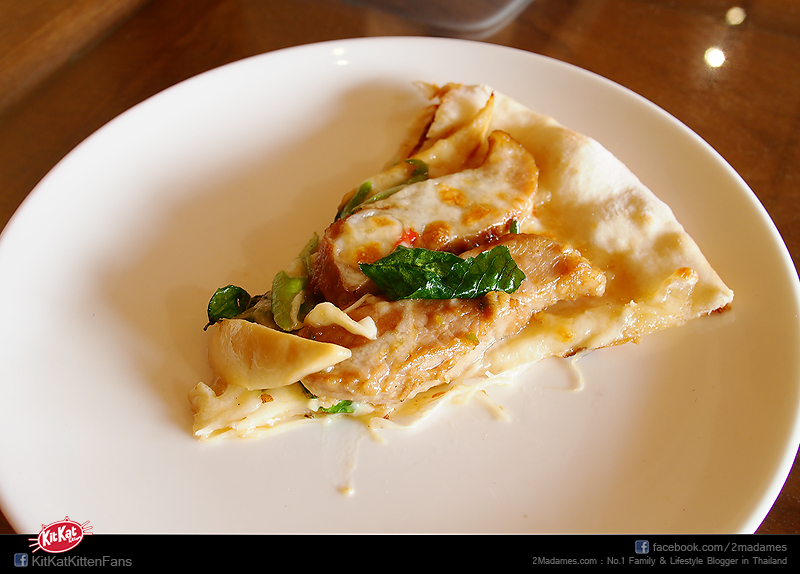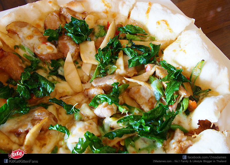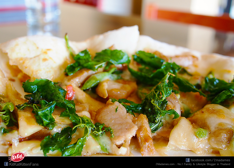 หน้าของพิซซ่าจะใส่หมูนุ่มๆชิ้นโตๆ เห็ด ถั่วฝักยาว และใบกะเพรากรอบ รสชาติเผ็ดนิดๆกำลังดี เข้ากันกับชีส อร่อยๆมากๆเลยค่ะ แถมแป้งก็เป็นแบบบางกรอบแบบอิตาเลียน เป็นฟิวชั่นที่ผสมผสานกันอย่างลงตัว ขอบอกเลยว่าไม่เลี่ยนเลยค่ะ