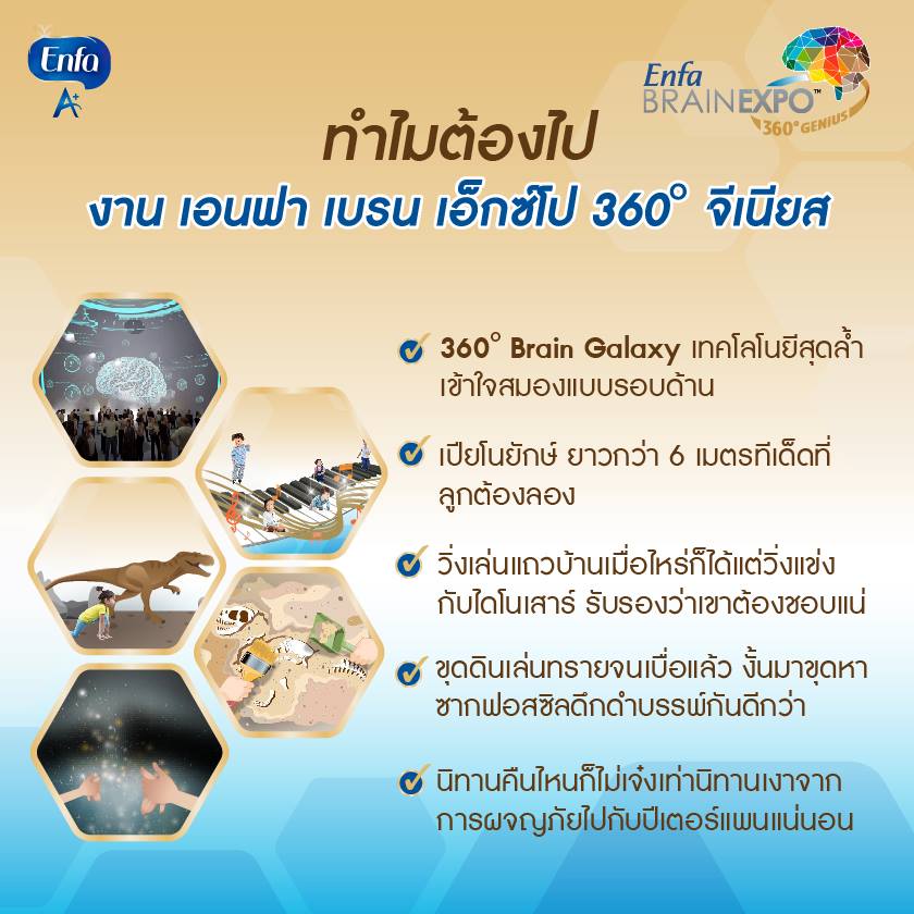 บริษัท มี้ด จอห์นสัน นิวทริชัน (ประเทศไทย) จำกัด และกลุ่มผลิตภัณฑ์เอนฟา เอพลัส จัดงาน ‘เอนฟา เบรน เอ็กซ์โป 360° จีเนียส’ งานแสดงนิทรรศการสมองและการเรียนรู้ครั้งยิ่งใหญ่ที่สุด ให้คุณพ่อคุณแม่ พาลูกน้อยมาร่วมปลดล็อกศักยภาพสมองกับสุดยอดประสบการณ์ ในกิจกรรมเชิงปฏิบัติการเต็มรูปแบบครั้งแรกในประเทศไทย กับ 4 ปฏิบัติการทางสมอง เส้นทางสู่ 360° อัจฉริยะรอบด้าน