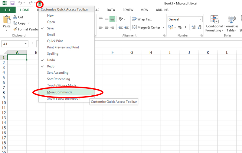 ขั้นตอนการเปลี่ยนก็ไม่ง่ายเลยครับ แค่เปิดโปรแกรม Excel ขึ้นมา จากนั้นก็กดเครื่องหมายอันด้านขวาสุดของแถบด้านซ้ายบน แล้วเลือก More Commands