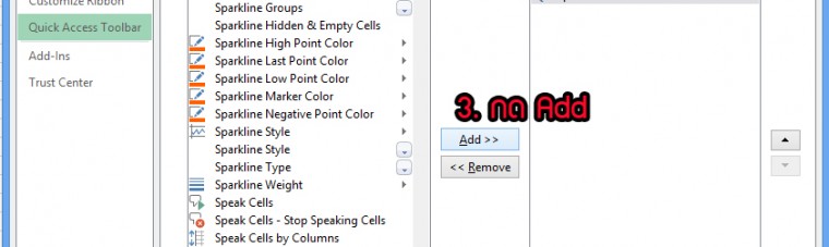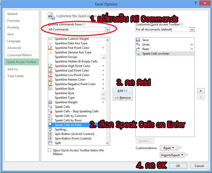 หลังจากนั้น เป็นกล่อง Choose commands from เป็น All Commands แล้วเลื่อนลงมาหา Speak Cells on Enter