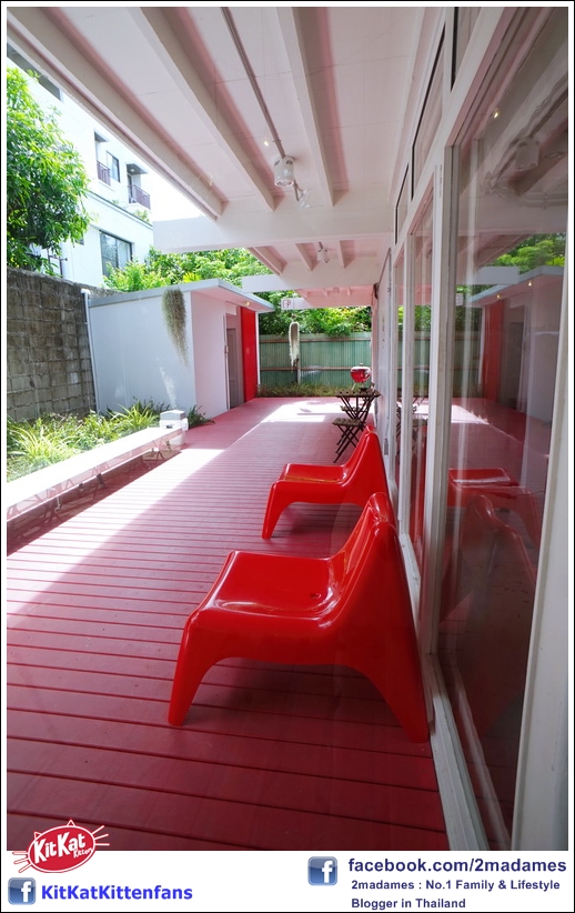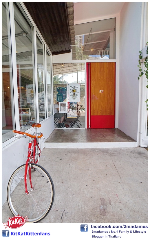 ด้านหน้ามีจักรยานสีแดงจอดอยู่ การตกแต่งภายนอกจะใช้สีขาวและสีแดงค่ะ