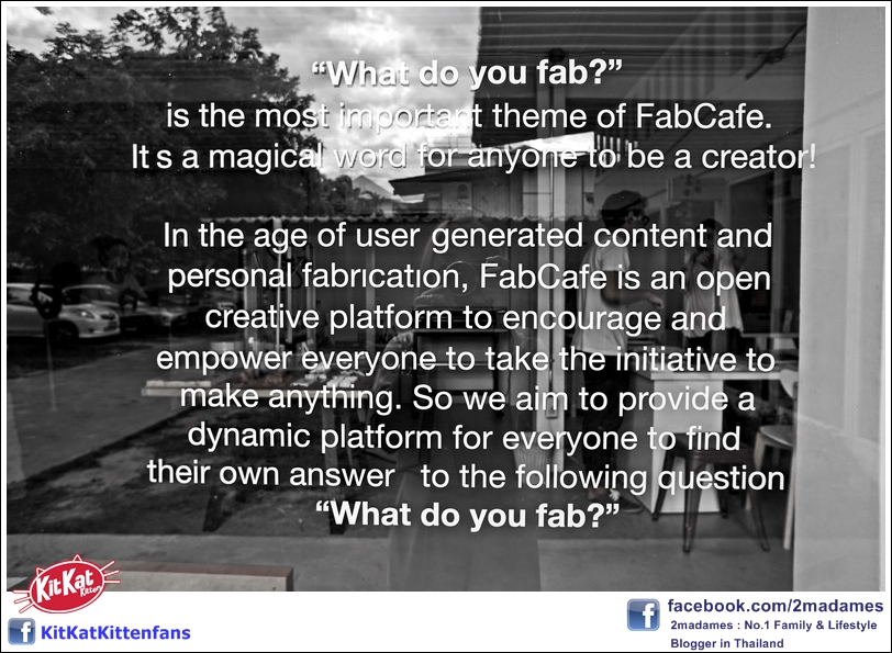 ก่อนจะเข้าร้าน เหมียวๆเดินผ่านแล้วเห็นข้อความของ Cafe ซึ่งบรรยายที่มาของ FabCafe และพื้นที่ของห้องนี้เป็นส่วนของ Fablab หรือ Workplace ค่ะ