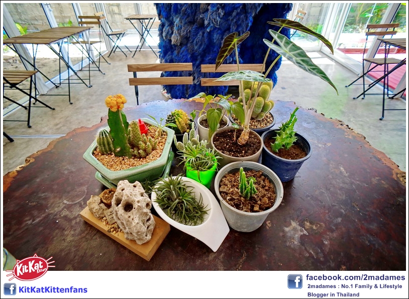 โต๊ะตรงกลางมีโซนสวนต้นไม้เล็กๆบนโต๊ะไม้ตัวใหญ่ เติมให้ความสดชื่นให้ร้านและให้ลูกค้าได้พักสายตาด้วยสีเขียวๆ