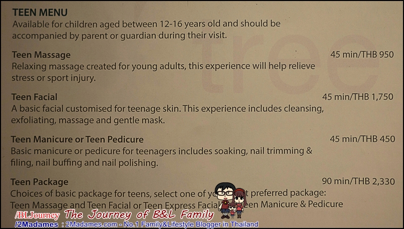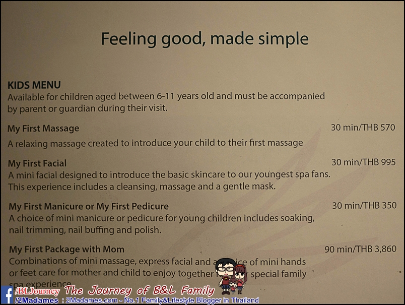 My First Package with Mom เป็นเมนูการนวดผ่อนคลายที่ถูกพัฒนาขึ้นมาพิเศษสำหรับคุณหนูที่ต้องการทำสปาพร้อมกับผู้ปกครองโดยเฉพาะ เป็นการนวดผ่อนคลายและใช้เวลาในวันพักผ่อนไปด้วยกัน ระยะเวลาของทรีทเม้นท์คือ 90 นาที