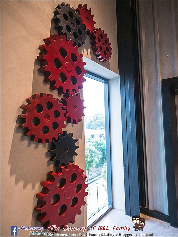 ออกจากลิฟท์มาก็จะเจอฟันเฟืองตัวใหญ่ บรรยากาศการตกแต่งทำให้รู้สึกเหมือนอยู่ในโรงงานเลยครับ สร้างบรรยากาศการประชุม สัมมนา อบรมได้ดีเลยครับ
