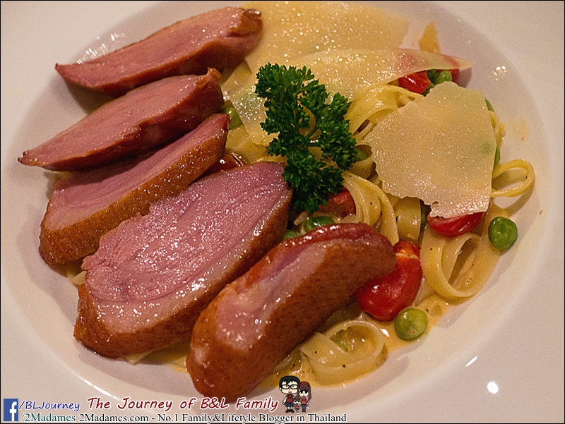 Duck Tagliatelle Spaghetti (สปาเก็ตตี้อกเป็ดรมควัน) สปาเก็ตตี้ครีมซอส ผัดกับกระเทียม ถั่วลันเตา มะเขือเทศเชอรรี่ พาร์เมซานชีส เสิร์ฟพร้อมกับอกเป็ดรมควันครับ รสชาติตัวเส้นและเครื่องโอเคเลยครับ แต่เป็ดเหนียวไปนิดนึง