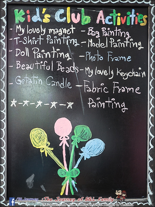 กิจกรรมภายในนะครับมีจัดกิจกรรมสำหรับเด็กๆหลากหลายไม่ว่าจะเป็นระบายสีปูนปลาสเตอร์ เพ้นท์ภาพ เล่นแต่งตัว Internetและเกมส์ต่างๆ ที่ Kid’s Club ยังมีพนักงานคอยให้การดูแลเด็กๆด้วยครับ