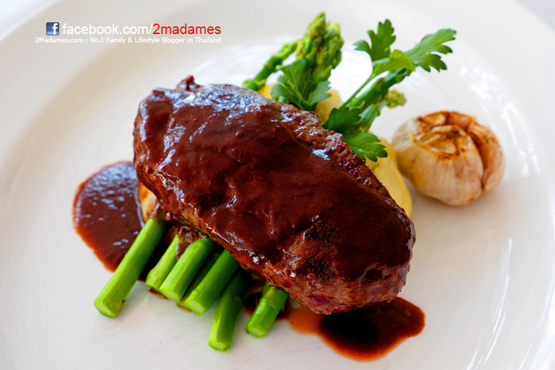 เชฟจะต้องพิถีพิถันมาก ซึ่งชิมแล้ว ก็ตรงใจผมสุดๆ เสต็กเนื้อนุ่มๆ เสิร์ฟคู่มันบด หน่อไม้ฝรั่ง กระเทียมอบ และราดด้วยซอสไวน์