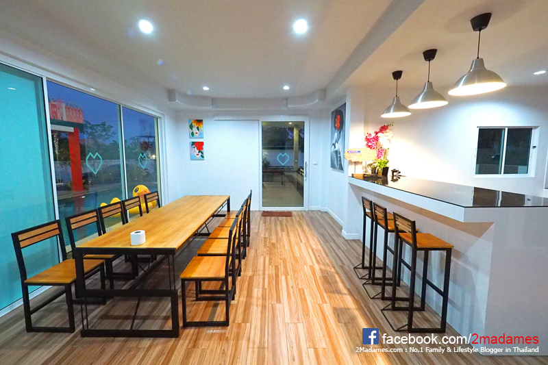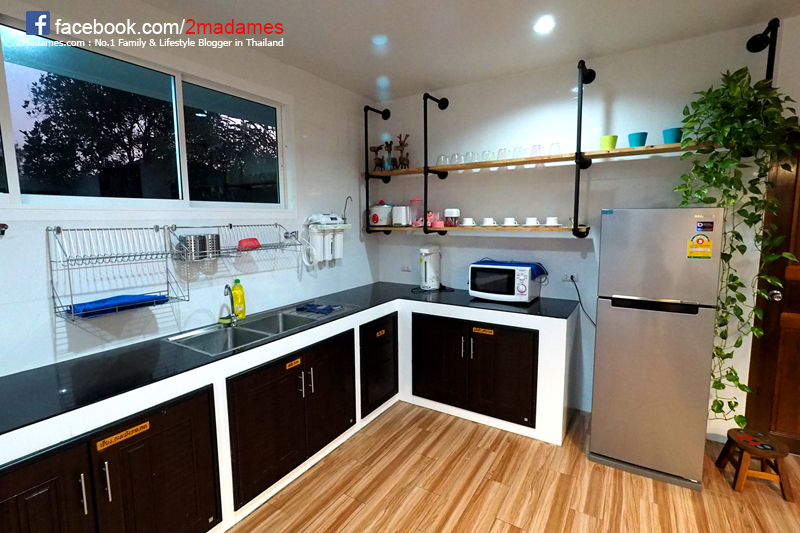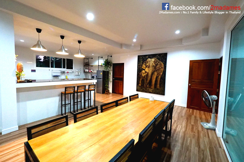 แตกต่างกับโรงแรมทั่วไป ที่ฟาร์มสุข พลูวิลล่า จะมีพื้นที่ส่วนกลางอย่างห้องครัว พร้อมโต๊ะรับประทานอาหารไซค์ขนาด 10 คนนั่งสบายๆอยู่ด้วย
