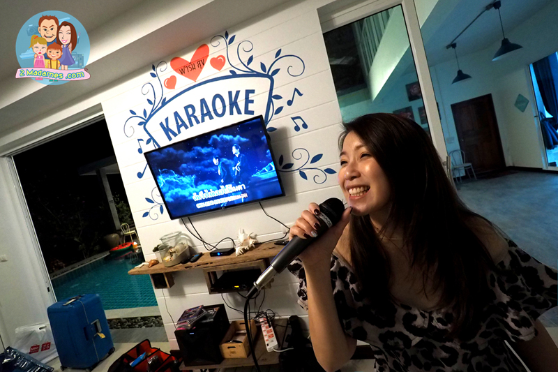 ห้องนั่งเล่นอีกฝั่ง จะมีโซฟาพร้อมเครื่องเสียง และคาราโอเกะด้วย