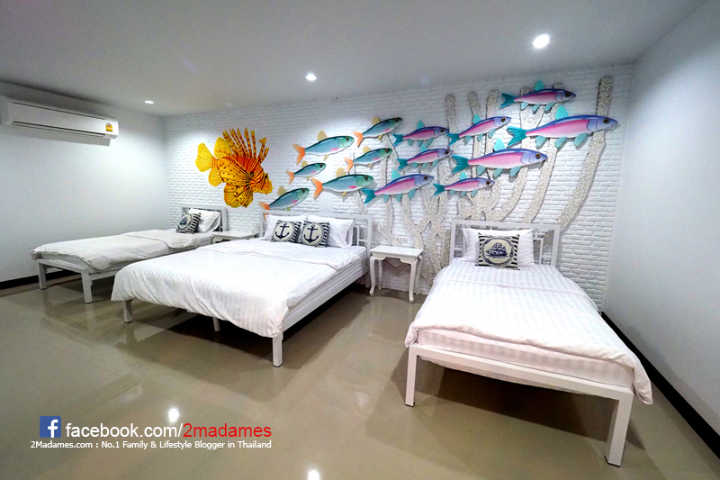 เริ่มจากชั้นล่างเลยนะ ห้องแรกตกแต่งด้วยฝูงปลา และปลาสิงโตสีสวย นอนได้ 4 คน