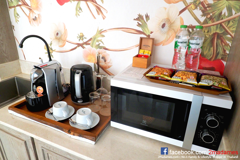 มี Pantry เล็กๆ พร้อมกับเตาไมโครเวฟ กาต้มน้ำ และมินิบาร์ต่างๆ