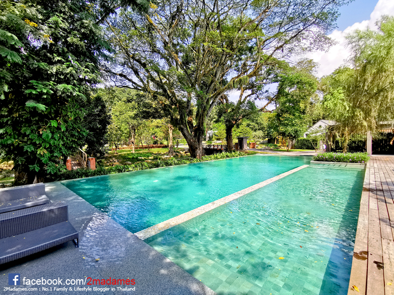 จากห้องนั่งเล่นเดินออกไปจะเป็นสระว่ายน้ำส่วนตัวในวิวสวนเขียวๆ สบายตา