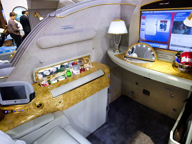 Emirates สายการบินแรกที่ติดตั้งประตูสไลด์ในห้องผู้โดยสารแบบ First Class สะดวกสบายด้วยพื้นที่ที่จัดสรรมาอย่างลงตัว มีบริการ Turndown เปลี่ยนเก้าอี้ให้เป็นที่นอนเหมือนโรงแรม มาพร้อมกับมินิบาร์ส่วนตัว ตู้เสื้อผ้าส่วนตัว มีห้องอาบน้ำและสปาบนเครื่อง รวมทั้งกระจกติดดวงไฟไว้ให้สาวๆสำหรับการแต่งหน้าด้วย