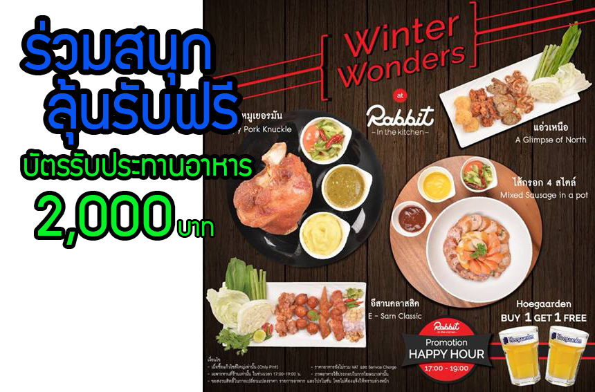 ร่วมสนุกลุ้นรับฟรี บัตรรับประทานอาหารมูลค่า 1,000 บาท 2 รางวัล จากร้านอาหาร Rabbit in the Kitchen ร้านอาหารไทย สยามแสควร์ ซอย 11 กับเมนูใหม่ล่าสุด Winter Wonders (Gift Voucher สามารถใช้ได้กับทุกเมนูในร้านฯ ตั้งแต่วันนี้ – 31ธ.ค. 2557)