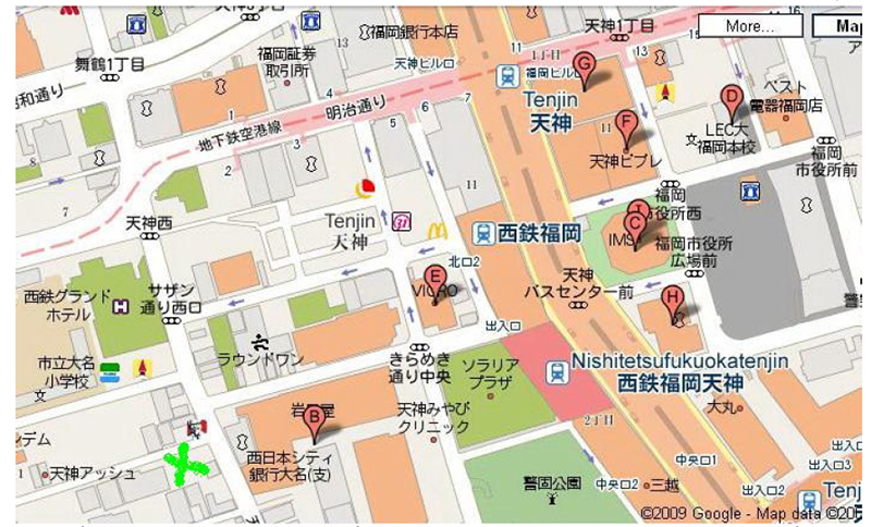 พิกัดร้านนี้คือ กากบาทสีเขียวในแผนที่ครับ ถ้าออกจากสถานี Tenjin ก็ให้ด้านออก West Exit หาห้าง Iwataya (จุด B) แล้วเดินข้ามถนนไปก็ถึงแล้วครับ