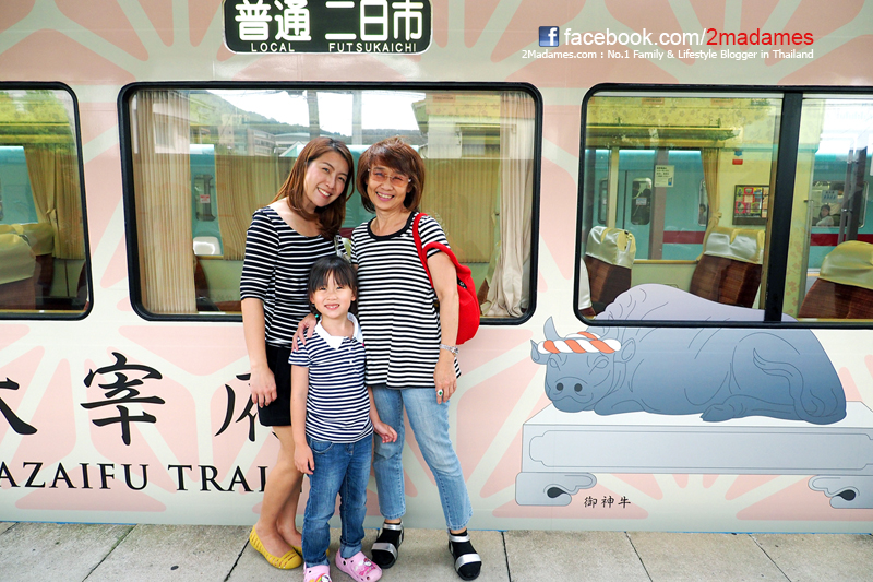 การเดินทางต้องออกจากสถานี Tenjin แล้วเปลี่ยนเป็น Dazaifu Line จอดที่ถนนทางเข้าศาลเจ้าเลย ขบวนรถไฟสีสวยมากเลย