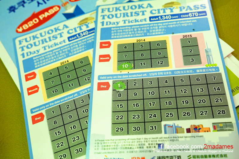 ซึ่งสำหรับผมแล้วต้องไปที่พักย่าน Tenjin ด้วยพอดี เราจึงสอย Fukuoka City and Dazaifu Pass มาเลยครับ คุ้มสุดๆ เพราะงานนี้เด็กๆทั้งสองคนฟรีครับ ลักษณะบัตรโดยสารของ Fukuoka City and Dazaifu Pass ที่ได้มาจะเป็นแบบในรูปด้านล่างเลยครับ จะใช้วันไหนก็ขูดเลขวันที่และเดือนเลย เพราะฉะนั้นใครลงเครื่องมาเช้าๆแล้วเปิดใช้เลย ก็ถือว่าคุ้มราคาอยู่จ้า