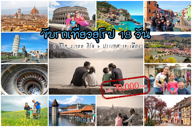 เมษายน 2016 ครอบครัวเรา 4 ชีวิตออกเดินทาง 18 วัน ขับรถท่องเที่ยวใจกลางยุโรปผ่าน 4 ประเทศ เยอรมัน ฝรั่งเศส สวิสเซอร์แลนด์ และอิตาลี จากเมืองแฟรงก์เฟิร์ตสู่เมืองเวนิส ผ่านปราสาทและไร่องุ่นสวยๆ เยือนเมืองท่องเที่ยวสำคัญที่เป็นมรดกโลกนับสิบๆเมือง ได้มีโอกาสสัมผัสทะเลสาบและภูเขาหิมะที่แสนงดงาม นั่งเล่นในอ้อมกอดของครอบครัวท่ามกลางแสงแดดอบอุ่นที่กระทบยอดหญ้าอันเขียวขจีในแคว้นทัสคานี ประเทศอิตาลี เราใช้งบประมาณไปไม่ถึง 70,000 บาทต่อคน แต่ต้องเที่ยวแหลก กินกระจุย เดินทางสบาย ที่พักแต่ละที่ต้องสวยแต่ต้องไม่แพงจนเกินไป ผมได้เขียนรีวิวแบบละเอียดยิบที่พร้อมจะทำให้ทุกครอบครัวเดินตามรอยได้ ตามไปชมรีวิวนี้กันครับ