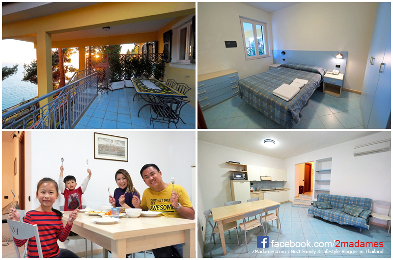 ที่พักที่นี่ชื่อว่า Residence Cielo e Mare อยู่บนเขาสูงมองลงไปเห็นทะเลสวยๆ เรียกว่าเหมือนวิวรีสอร์ทหรูที่ภูเก็ตเลย ห้องพักเป็นแบบอพาร์ทเม้นท์กว้างมากๆ มีหนึ่งห้องนอน ห้องนั่งเล่นใหญ่มาก มีโซฟาแปลงร่างเป็นที่นอนได้ มาพร้อมครัวอุปกรณ์ครบชุด คุณนายแอนเลยได้โชว์ฝีมือทำกับข้าวอาหารไทยให้ทุกคนได้ทาน พอคลายความคิดถึงเมืองไทยลงไปได้บ้าง ตอนจองที่พักอ่านรีวิวคอมเม้นท์มาคะแนนสูงมาก โดยเฉพาะกลุ่มครอบครัวที่มีเด็กให้ 10 คะแนนหมดเลย พอมาพักจริงๆ ถูกใจจริงๆด้วย คะแนนรีวิวช่วยได้มากจริงๆ ราคา 109 ยูโร แต่มีค่าผ้าเช็ดตัวและผ้าคลุมเตียงอีกคนละ 6 ยูโรครับ