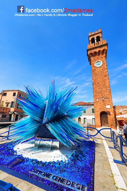 ตรงใจกลางเกาะ Murano มีประติมากรรมแก้วสีน้ำเงินตั้งเด่นเป็นสง่าอยู่คู่กับหอนาฬิกา เก๋เชียวครับ