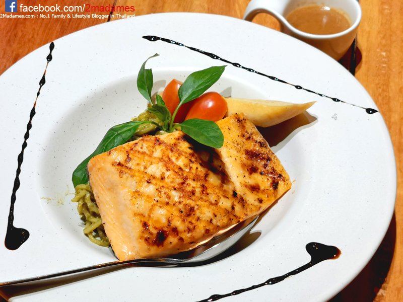 คือต้องบอกว่าอาหารที่นี่ จัดจานมาหน้าตาดีเวอร์ แถมอร่อยด้วยนะ อย่างสปาเก็ตตี้เพรสโต้แซลมอนชิ้นโตจานนี้ แค่ 250 บาทเอง