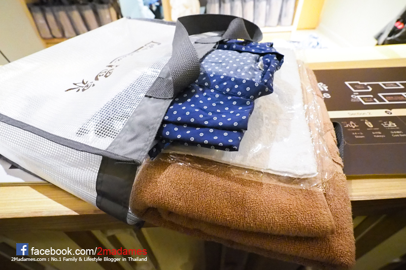 ในกระเป๋าก็จะมีชุดจิมเบอิ เป็นชุดอยู่บ้านสไตล์ญี่ปุ่น ไว้ให้เราใส่เวลาที่อยู่ใน Relax area และมีผ้าขนหนูผืนเล็กสีขาวๆอันนี้ไว้ให้เป็นสมบัติส่วนตัวนำกลับบ้านได้เลย