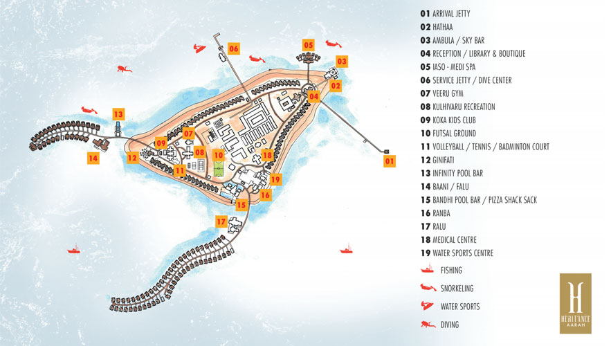 Heritance Aarah (เฮอริแทนซ์ อาราห์) อยู่ด้านเหนือของมาเล่ เมืองหลวงของประเทศมัลดีฟส์ เดินทางต่อโดย Seaplane ประมาณ 40 นาที มีห้องพักแบบทั้ง Ocean Suite (เฉพาะคู่รัก) Ocean Villa (วิลล่ากลางมหาสมุทร) และ Beach Villa (บ้านพักริมหาด) มี 7 ห้องอาหาร 5 บาร์เครื่องดื่ม ล้อมรอบด้วยน้ำทะเลสีฟ้าใส นับเป็นรีสอร์ทหรูระดับ 5 ดาวขนาดใหญ่