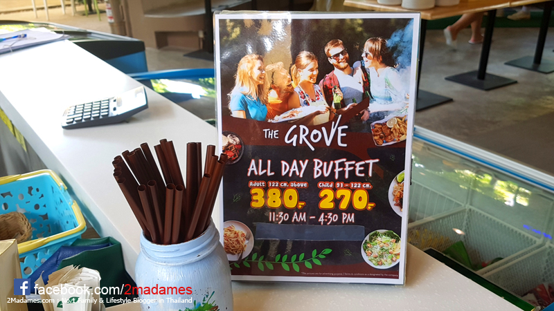 สำหรับเรื่องอาหารการกินในสวนน้ำนั้น ขอบอกว่าอย่าได้ต้องเป็นห่วง เพราะที่ The Grove เค้ามีบริการอาหารแบบบุฟเฟ่ต์ที่จะเข้าออกทานกี่ครั้งก็ได้ตั้งแต่เวลา 11.30 น. – 16.30 น. ผู้ใหญ่ราคา 380 บาท เด็กราคา 270 บาท