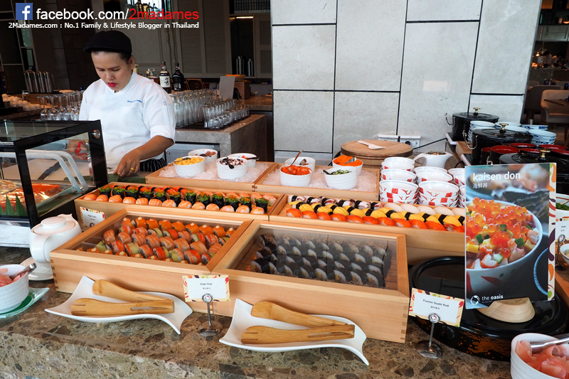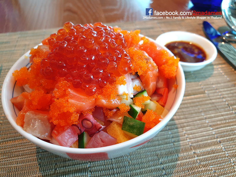 Kaisen Don เป็นสิ่งที่ห้ามพลาดในไลน์บุฟเฟ่ต์นี้ เมนูนี้เป็นข้าวหน้าปลาดิบรวมที่มีทั้งแซลมอน ปลาโอ ไข่แซลมอน ไข่กุ้ง ปลาหมึกยักษ์ ไข่หวาน แตงกวา ปูอัด คลุกเคล้าปิดข้าวจนมิดเลย