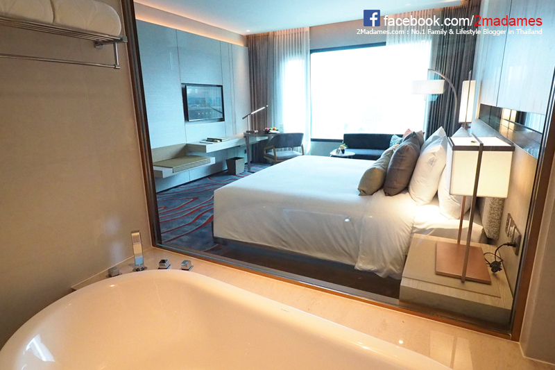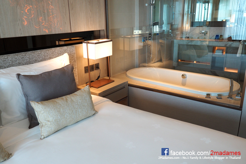 ผนังห้องน้ำเป็นแบบกระจก เตียงและอ่างแช่ตัวจะสามารถมองเห็นกันได้เลยครับ