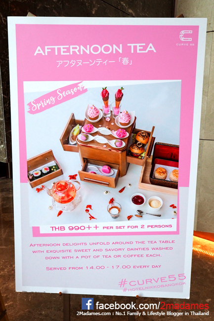 ช่วงบ่ายๆเวลา 14.00-17.00 น. ที่ CURVE55 บริเวณล็อบบี้ Hotel Nikko Bangkok เค้ามีบริการ Afternoon Tea Set ที่ช่วงนี้เป็นเทศกาล Spring Season ที่จัดเซ็ตมาได้น่ารักมุ๊งมิ้งสีหวานเหมือนดอกซากุระที่กำลังบานอยู่ในช่วงนี้ที่ญี่ปุ่น สนนราคา 990++ บาท สำหรับ 2 ท่าน คอนเซปต์การจัดก็จะเปลี่ยนแปลงตามฤดูกาลของทางญี่ปุ่นเลย ใจนี่อยากจะตามเก็บและลองชิมให้ครบทุกเทศกาลเลยจ้า