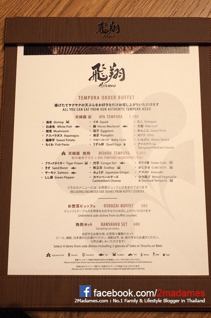 ที่ห้องอาหาร Hishou นี้ จะให้บริการเทปุระแบบบุฟเฟ่ต์ โดยให้สั่งตามออเดอร์และทอดกันสดๆใหม่ๆ ราคาเทมปุระบุฟเฟ่ต์จะมี 2 ราคา คือ AYA Tempura 1,100++ และ HISHOU Tempura 1,900++ บาท ราคารวมเครื่องดื่มชาร้อน/ชาเย็นแบบรีฟีลให้แล้ว รายละเอียดว่าแต่ละราคาเลือกทานอะไรได้บ้างดุในรูปด้านล่างเลยจ้า