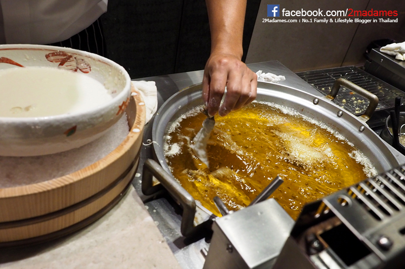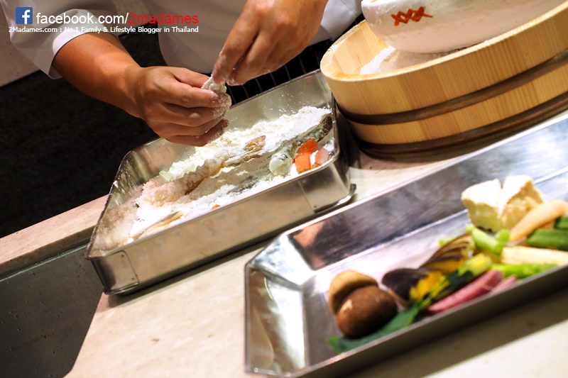อีกฟากของห้องอาหารจะเป็นครัวเปิดที่เชฟนำวัตถุดิบที่เราเลือกมาคลุกแป้งแล้วทอดเทมปุระให้ชมกันสดๆ แถมยังมีโซนที่นั่งหน้าเคาน์เตอร์บาร์สำหรับคนที่อยากให้เชฟทอดแล้วเสิร์ฟทานทีละชิ้นได้ด้วยนะ ได้อารมณ์เหมือนที่เคยไปทานร้านดังที่ญี่ปุ่นเลย