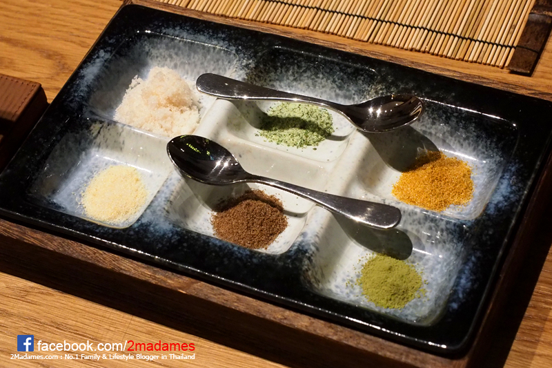 เวลาทานตามแบบฉบับญี่ปุ่นจะจิ้มทานกับเกลือรสชาติต่างๆ วันที่พวกเราไปทานเสิร์ฟเกลือมา 6 รสชาติด้วยกัน ทั้งเกลือธรรมชาติ, เกลือวาซาบิ, เกลือผงกะหรี่, เกลือส้มยูซุ, เกลือพริกไทยดำ และเกลือมัทฉะ ขอบอกว่าอร่อยและถูกปากทุกรสชาติ แต่ที่ชอบมากที่สุดคือเกลือมัทฉะ อยากให้ทุกคนได้ลองจริงๆ